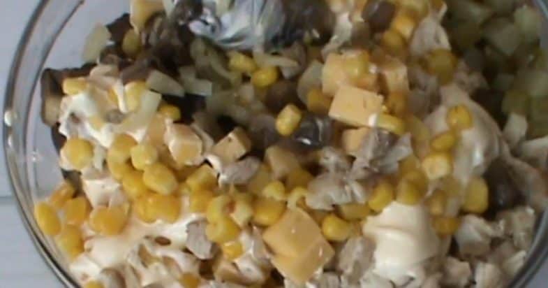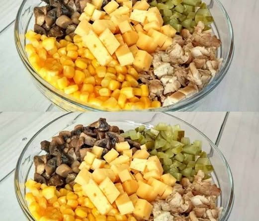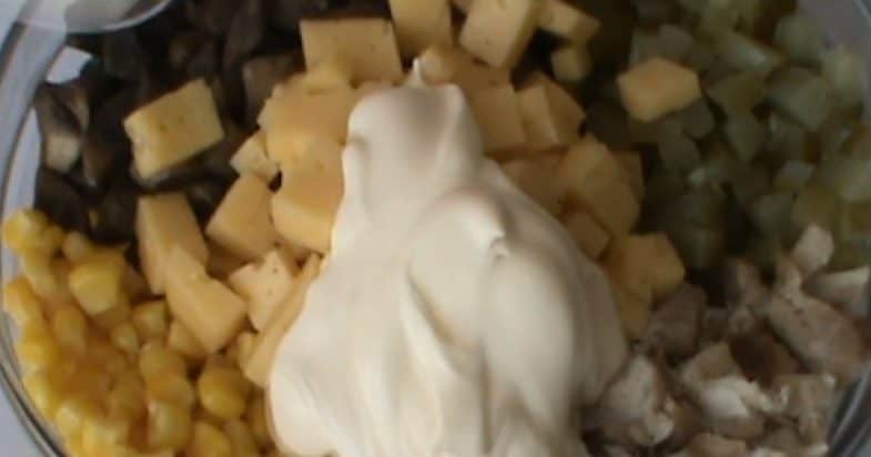 Відварене м’ясо, твердий сир та мариновані огірки нарізаю квадратиками. Всипаю консервовану кукурудзу.